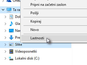 Kliknite z desnim miškinim gumbom na mapo s slikami in izberite Lastnosti.
