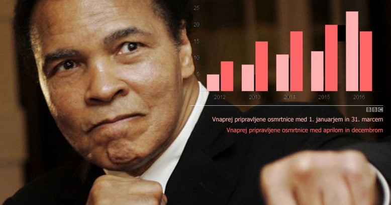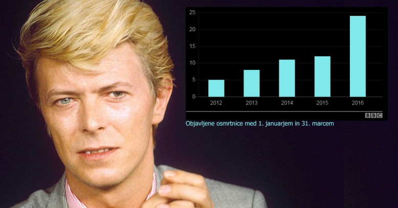 David Bowie, Prince, Harper Lee, Alan Rickman, Nancy Reagan, Muhammad Ali, Sir George Martin, Victoria Wood, Leonard Cohen, George Michael itd … Za ljubitelje njihove umetnosti je bilo leto 2016 res žalostno leto. Meseca Aprila so zato avtorju osmrtnic na BBC-ju dali nalogo, da preveri, ali se je dogajalo res kaj nenavadnega, kot to navajajo socialna omrežja. Novinar se je lotil dela in zbral vse osmrtnice, ki so se objavile na različnih medijih med januarjem in marcem v obdobju 2012-2016. Dognal je, da se je v primerjavi z ostalimi leti prve tri mesece statistika močno povečala. Dvakrat več znanih ljudi je umrlo v tem obdobju, če ga primerjamo z letom 2015 in petkrat več kot leta 2012.