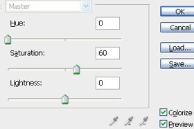 Označite Colorize in se poigrajte z drsniki. Jaz sem določil Hue 0, Saturation 60 in Lightness 0. Kliknite na gumb OK. |
