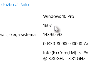 ![]() Na desni strani dobimo izpisano, katero verzijo oz. različico uporabljamo. Tako lahko vidimo, ali uporabljamo Pro ali Home verzijo. Zelo pomemben pa je tudi podatek, ki prikazuje Različico, v mojem primeru 1607. Ta določa, katera večja posodobitev je bila nazadnje naložena na vaš računalnik.