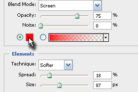 Kliknite v kvadratek za določanje barve in izberite poljubno barvo. Potem pa se igrajte z drsnikoma Spread in Size ter potrdite na gumb OK. Jaz sem določil Spread 18 % in Size 87 px. |