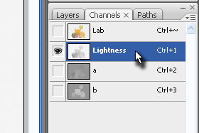 Sedaj v paleti layerjev kliknite na zavihek Channels in označite samo Lightness (glej sliko).