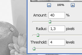 V novem oknu določite Amount 40 %, Radius 1,3 pixels in Threshold 4 levels. Kliknite na gumb OK. |