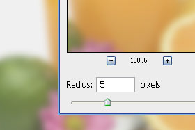 Kliknite zgoraj na Filter, Blur in izberite Gaussian Blur... V novem oknu določite Radius 5 pixels in kliknite na gumb OK. |