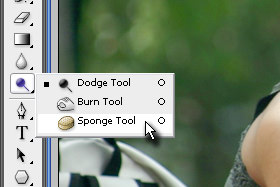 Izberite orodje Sponge Tool. Držite z miško na orodju Dodge Tool (bližnjica je tipka O) toliko časa, dokler se ne prikažejo ostala orodja. |