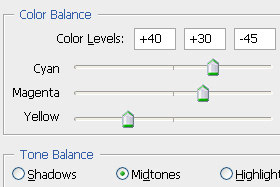 Midtones naj ostane označeno. Poigrajte se malo z drsniki Cyan, Magenta in Yellow. Jaz sem nastavil Color Levels na +40 | +30 | -45. Kliknite na gumb OK. |