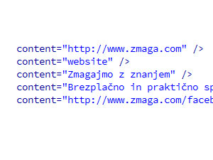 ![]() In prilepim naslednje podatke, katere seveda po želji sami uredite. <meta property="og:url" content="http://www.zmaga.com" /> <meta property="og:type" content="website" /> <meta property="og:title" content="Zmagajmo z znanjem" /> <meta property="og:description" content="Brezplačno in praktično spletno učenje" /> <meta property="og:image" content="http://www.zmaga.com/facebook_stran/facebook_slika.jpg" /> |
