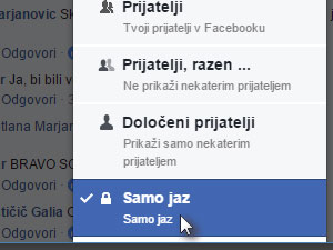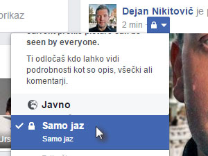 ![]() ... in izberite Samo jaz. To pomeni, da boste to objavo videli le vi in nihče drug. Pa naj bo to slika, besedilo ali povezava. |