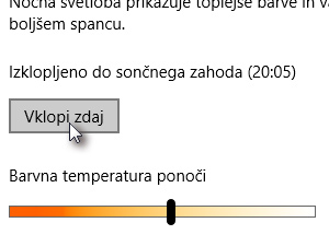 ![]() Za takojšen vklop pa kliknite na gumb Vklopi zdaj. Ko bo sistem nočne svetlobe vklopljen, lahko nastavljate barvno temperaturo po želji. |