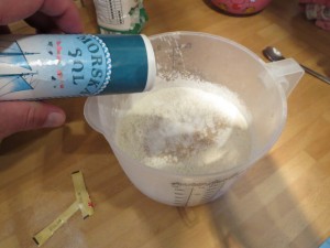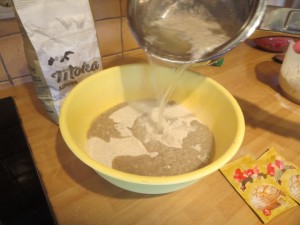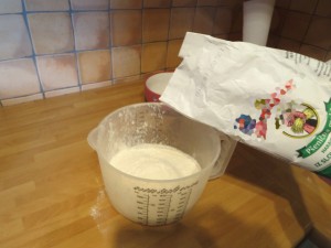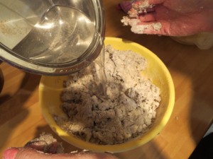 Vse skupaj mešajte in vmes dodajte 2.5 dcl mlačne vode. |