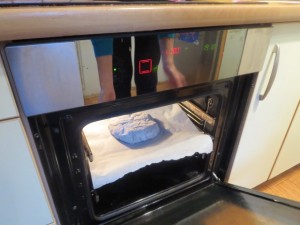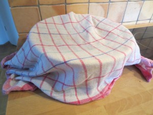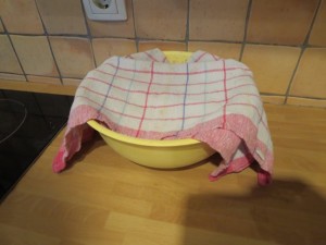 Postavite testo v posodo in jo pokrijte z neko krpo. Pustite, da testo vzhaja še pol ure. |