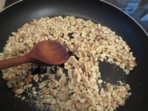 Sedaj postavite ponev na kuhalno ploščo s srednje nastavljeno temepraturo. Potem pa na to ponev dodajte orehe in jih malo popražite, ne pa preveč. |