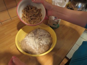 Popražene orehe dodajte k vzhajanemu testu, kateremu ste dodali nekaj ščepcev bele moke. Vse skupaj dobro premešajte, da se orehi dobro premešajo v testo. |