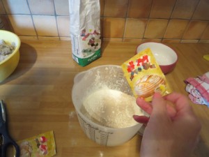 V posodo z belo moko dodajte še dve vrečki suhega kvasa. |