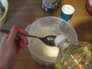 Dodajte še 6 žlic olja. Premešajte sestavine v tej posodi. |