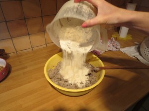 Sedaj pa vsebino iz posode z belo moko prenesite v prvo posodo, kjer ste dodali ajdovo moko. |