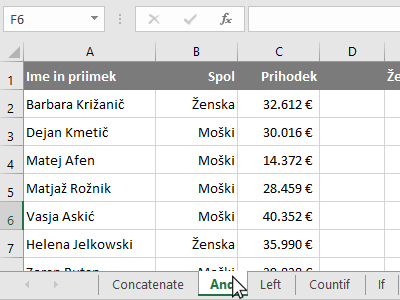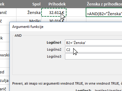 ![]() Potem pa kliknite v prazno celico, kjer boste izračunali, ali se v vrstici nahaja ženska z prihodkom nad 20.000 evri. |