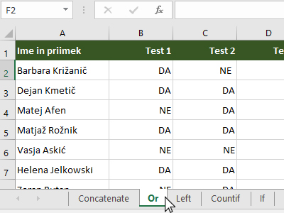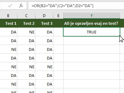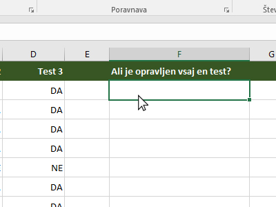 ![]() Potem pa kliknite v prazno celico, kjer boste izračunali, če je oseba na podlagi podatkov v celicah levo opravila vsaj en test. |
