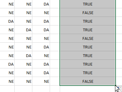 ![]() Če bo odgovor v vseh treh celicah vsaj enkrat DA, potem bo to Excelova funkcija smatrala kot pozitivino. Z miško označite prvo izračunano celico in kliknite dvakrat na pikico v spodnjem desnem robu (glej sliko). |