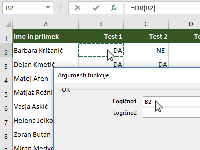 ![]() Kliknite še v polje Logično3 in označite celico, kjer se nahaja tretji rezultat in dopište ="DA" (glej sliko). Kliknite na gumb V redu. |