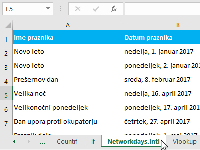 Lahko pa si tudi prenesete XLSX datoteko, kjer se namišljeni podatki že nahajajo (odprite zavihek Networkdays.intl).