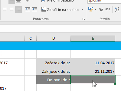 ![]() Nato pa označite celico, kjer boste izračunali število delovnih dni med dvema datuma, ki sta zapisana v svojih celicah (glej sliko). |