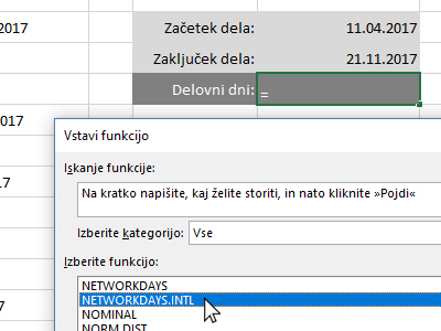![]() Pritisnite tipki Ctrl + F3, da vam odpre okno za vstavljanje funkcije. V novem oknu izberite kategorijo Vse. Potem pa v polju izbiranja funkcij poiščite, označite NETWORKDAYS.INTL in kliknite V redu. |