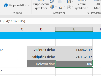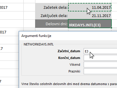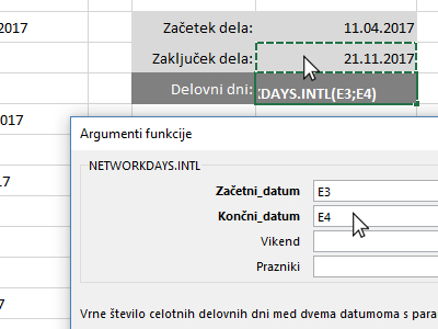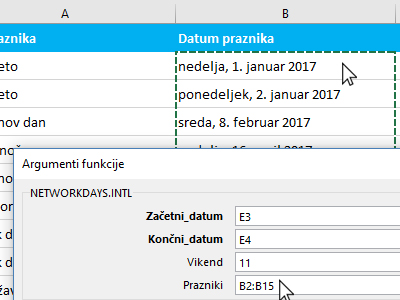 ![]() Excel vam je izračunal število dni med dvema določenema datuma. Vmes je upošteval praznike in tudi nastavitev vikendov.