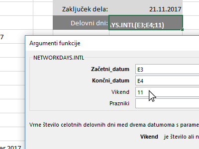 ![]() Kliknite v polje Vikend in vpišite 11, ker bi v tem vodiču radi pri vikendih upštevali, da je prost dan le nedelja. Če želite, lahko pustite polje prazno in Excel bo upošteval soboto in nedeljo. Spodaj pa imate ševilke, katere lahko po želji uporabljate. 1 - sobota, nedelja |