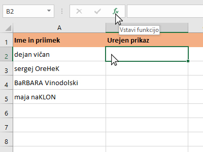 ![]() Označite celico, kjer boste nastavili lep prikaz besedila. Kliknite na Vstavi funkcijo. |