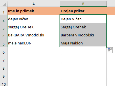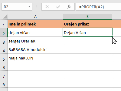![]() Excel je prikazal besedilo na urejen način, kjer je vsaki besedi dodal veliko začetnico. Z miško označite prvo urejeno celico z besedilom in kliknite dvakrat na pikico v spodnjem desnem robu (glej sliko). |
