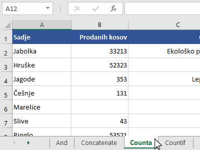 ![]() Ustvarite novo Excelovo razpredelnico in vpišite podobne podatke, kot sem jih jaz. Lahko pa si tudi prenesete XLSX datoteko, kjer se namišljeni podatki že nahajajo (odprite zavihek Counta). |