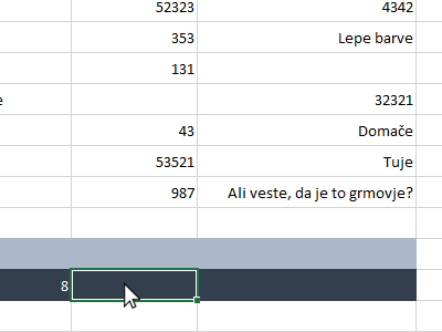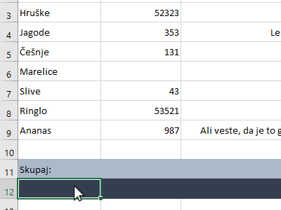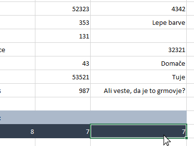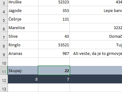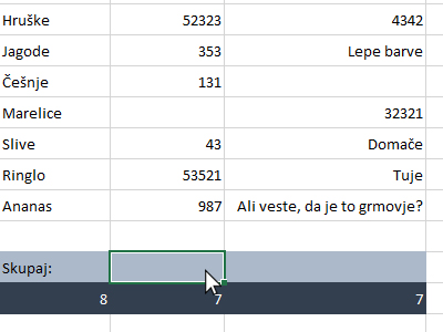 ![]() Excel vam je izračunal skupno število, v formuli pa ste stolpce ločili za lažjo kasnejše obdelovanje. |
