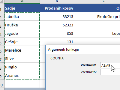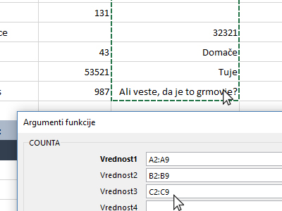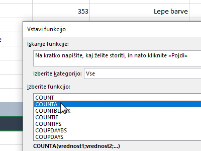 ![]() Pritisnite CTRL + F3, da odprete okno za vstavljanje funkcije. V novem oknu izberite kategorijo Vse. Potem pa v polju izbiranja funkcij poiščite, označite COUNTA in kliknite V redu. |