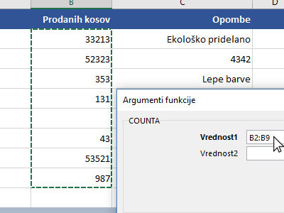 ![]() Ko se vam pojavi pogovorno okno, kliknite v polje Vrednost1 in nato označite celice, kjer bi radi izračunali njihovo skupno število (glej sliko). Kliknite na gumb V redu. |