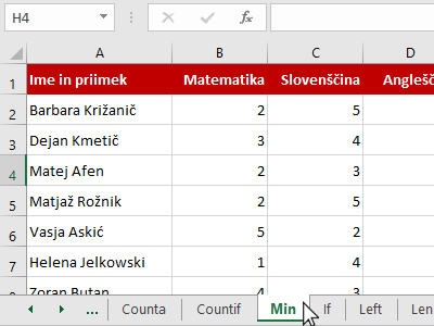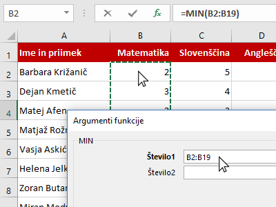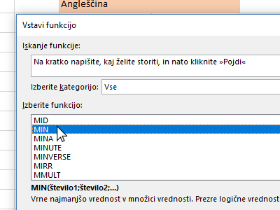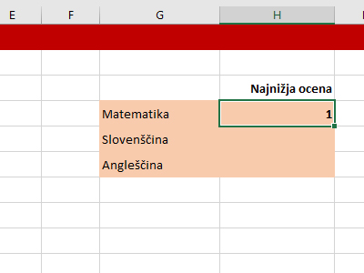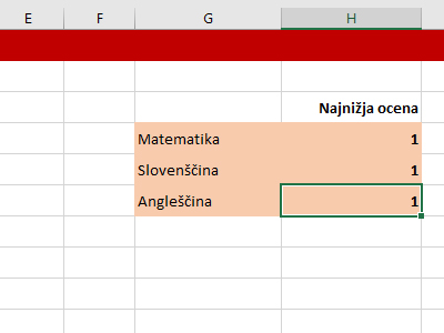 ![]() Excel vam je izračunal in prikazal najnižjo oceno iz matematike. |