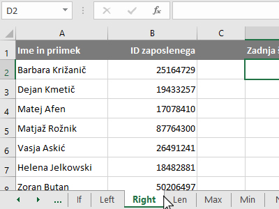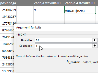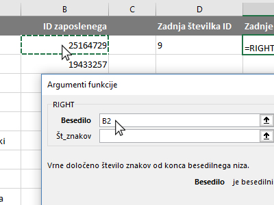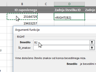 ![]() V novem oknu izberite kategorijo Vse. Potem pa v polju izbiranja funkcij poiščite, označite RIGHT in kliknite V redu. V pogovornem oknu kliknite v polje Besedilo in nato z miško označite celico z ID zaposlenega (glej sliko). |