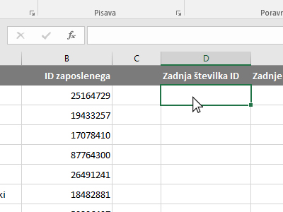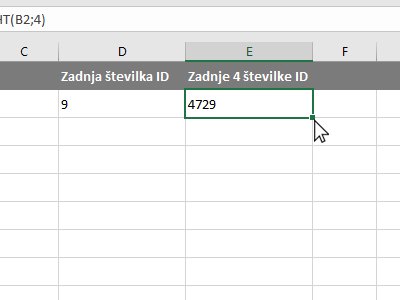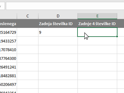 ![]() Excel je avtomatsko prikazal le zadnjo številko, saj nismo določili nobenega pogoja. Kliknite v prazno celico, kjer boste prikazali zadnje štiri številke iz celice ID zaposlenega. |