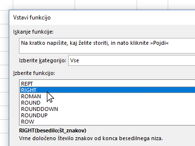 ![]() Pritisnite CTRL + F3, da odprete okno za vstavljanje funkcije. V novem oknu izberite kategorijo Vse. Potem pa v polju izbiranja funkcij poiščite, označite RIGHT in kliknite V redu. |