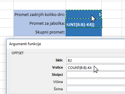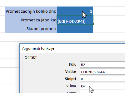 ![]() Nato kliknite v polje Višina in določite z miško celico za promet zadnjih dni (glej sliko). Višina predstavlja koliko celic naj Excel upošteva pri računanju. |