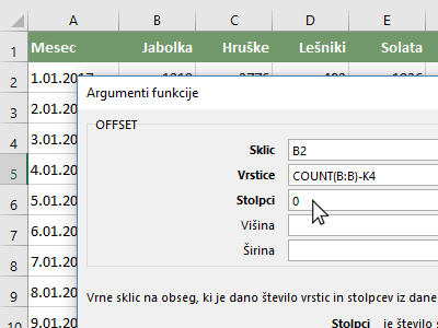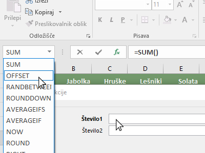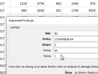 ![]() V pogovornem oknu kliknite v polje Število1 in nato z miško kliknite zgoraj levo v okno, kjer se doda novo funkcijo (glej sliko). Izberite OFFSET. |