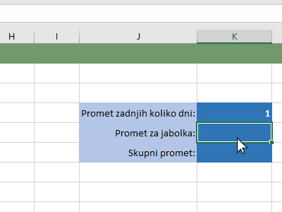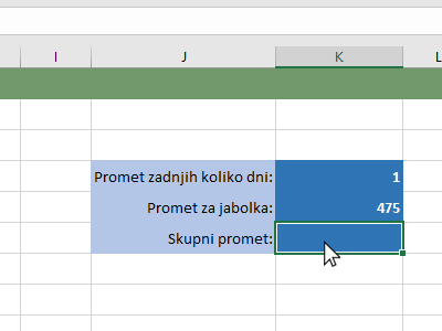 ![]() Excel vam je izračunal promet jabolk za zadnji dan. Kliknite v celico, kjer boste izračunali promet za vse artikle. |