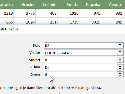 ![]() Ponovite postopek in v polje Širina vpišite 6 (glej sliko) ter kliknite na gumb V redu. Tukaj smo zajeli vseh šest stolpcev, kjer se nahajajo vsi artikli (jabolka, hruške, lešniki, solata, paprika in češnje). |