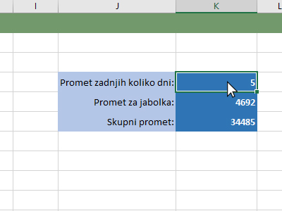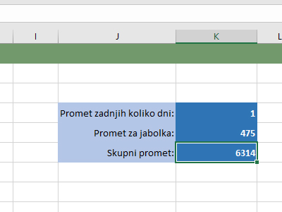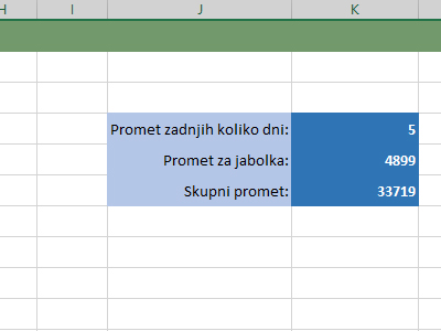 ![]() Excel vam je izračunal še skupni promet za vse artikle. Seveda to velja za zadnji dan oziroma toliko dni, kolikor ste jih nastavili v zgornji celici. |