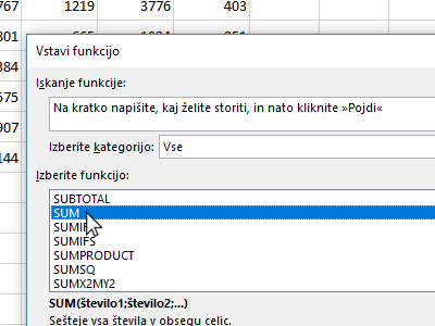 ![]() Ker Offset služi bolj kot za določanje celic, katere bomo uporabili pri računanju, bomo najprej začeli z osnovno fukcijo in potem znotraj nje določili, kaj naj pri računanju upošteva. Pritisnite CTRL + F3, da odprete okno za vstavljanje funkcije. V novem oknu izberite kategorijo Vse. Potem pa v polju izbiranja funkcij poiščite, označite SUM in kliknite V redu. |