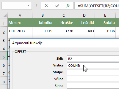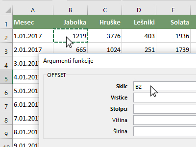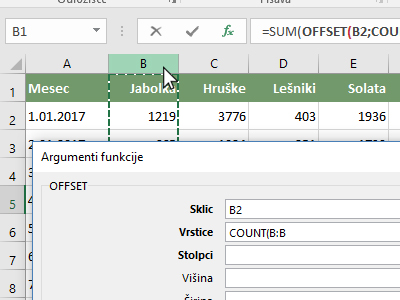 ![]() Nahajate se v funkciji OFFSET, kjer boste določili koordinate, katere bo Excel uporabil pri računanju. Kliknite v polje Sklic in izberite celico B2, ki predstavlja prvo prodajo jabolk. Od tukaj ste začeli "označevati" polje, katero naj Excel upošteva pri računanju. |