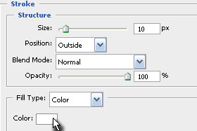 Potem pa določite poljuben Size in Color preko izbirnika belo barvo (glej sliko). Jaz sem Size določil 10 px. |