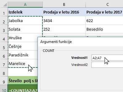 ![]() Pritisnite CTRL + F3, da odprete okno za vstavljanje funkcije. V novem oknu izberite kategorijo Vse. Potem pa v polju izbiranja funkcij poiščite, označite COUNT in kliknite V redu. V pogovornem oknu kliknite v polje Vrednost1 in nato z miško označite celice, kjer se nahajajo celice z podatki (glej sliko). Kliknite na gumb V redu. |
