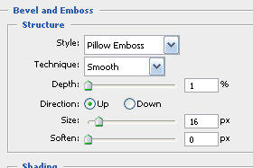 Style določite Pillow Emboss, Depth 1 %, Size 16. Ne zaprite še okna... |