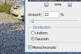 Potem določite Amount na 22 procentov, Distribution Gaussian in označite Monochromatic. |